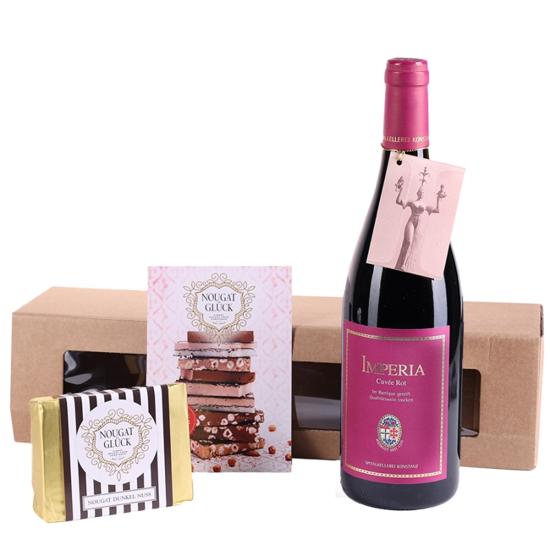 Das zartschmelzendes Konstanzer Nougat Dunkel Nuss (200g) und unser Imperia-Rotweincuvée bilden das perfekte Duo zum Verschenken oder um sich selber zu verwöhnen.