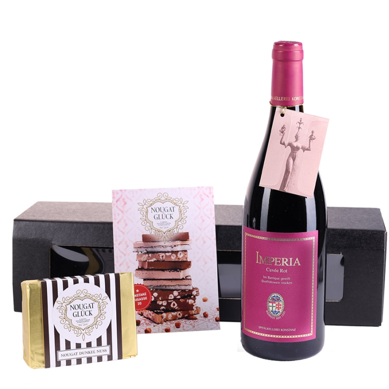 Das zartschmelzendes Konstanzer Nougat Dunkel Nuss (200g) und unser Imperia-Rotweincuvée bilden das perfekte Duo zum Verschenken oder um sich selber zu verwöhnen.
